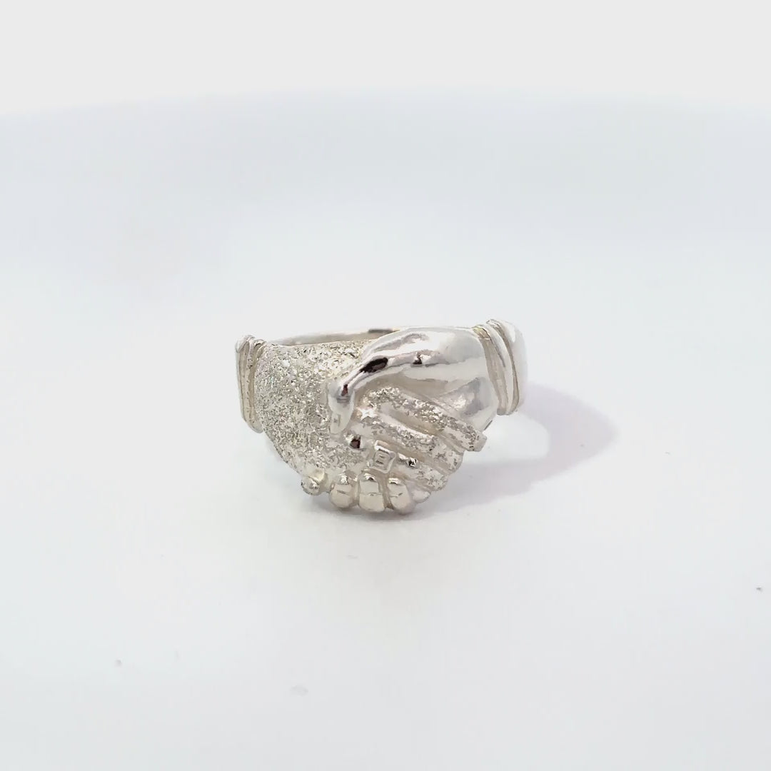Deze zilveren vriendschapsring heeft een diamond dust afwerking op één van de twee handen aan de bovenkant met een gladde band. De twee handen zijn 12 mm hoog en de band is 5 mm breed.